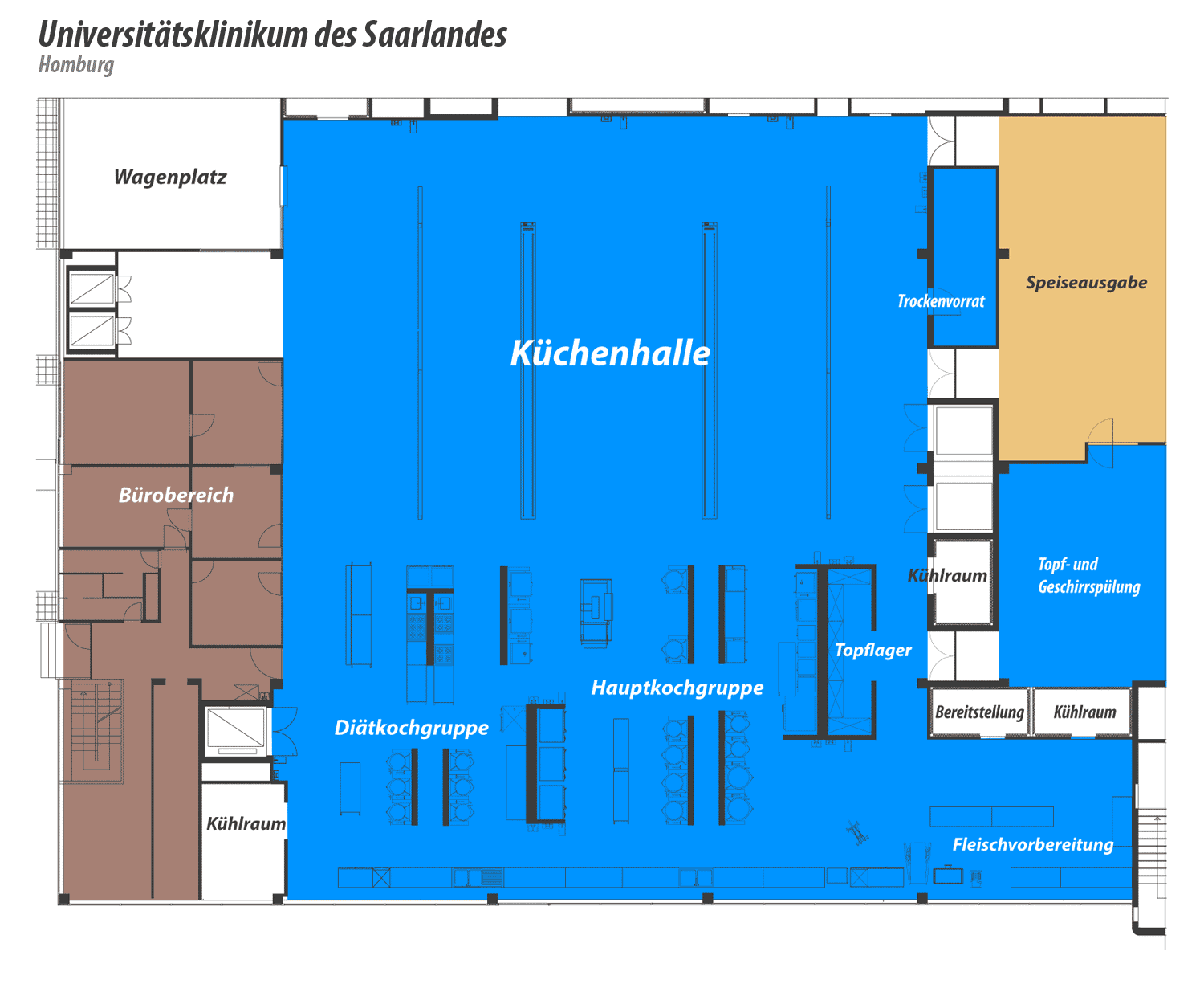 Auf Grund unserer jahrzehntelanger Erfahrung haben wir ein schlüssiges Konzept entwickelt und wurden im Rahmen eines Ausschreibungsverfahren mit der Erneuerung der Zentralküche und Personalspülanlage beauftragt. Hierzu gehörte auch die Planung und betriebsbereite Gestellung einer Interimslösung.
