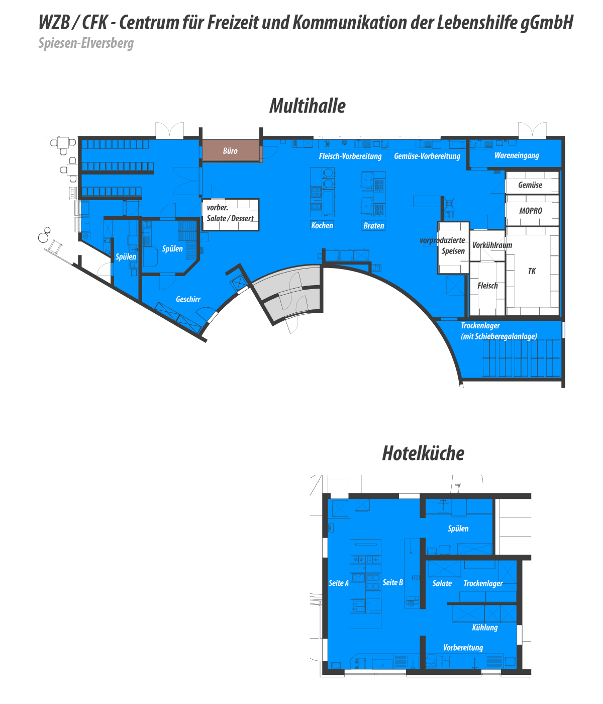 Von der Werkstatt für Behinderte der Lebenshilfe gGmbH (WZB) in Spiesen wurden wir Ende April 2005 mit der Generalplanung der Küchen-, Spül- und Kühltechnik für das Multifunktionsgebäude und der Hotelküche mit Bistro beauftragt.